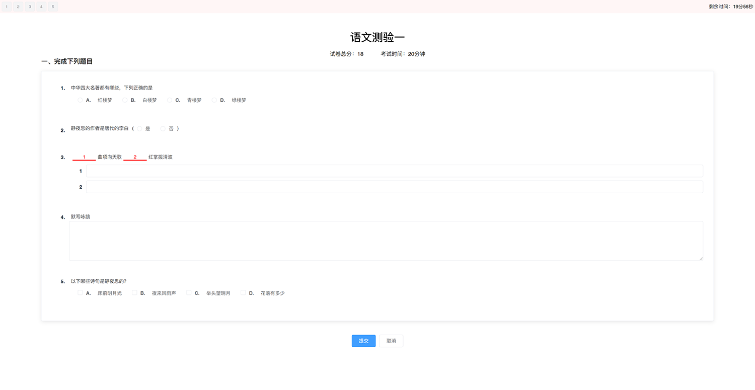 考试 题干支持文本、图片、数学公式、表格等,学生答题支持:文本