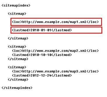 <loc>http://www.example.com/map1.xml</loc>识别Sitemap的位置(必填项)。这里提供的信息是您分割的Sitemap文件存放路径。