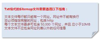 将如样例中写好txt格式的Sitemap文件保存至网站根目录下,如您的站点是www.example.com,文件名为sitemap.txt,则上传Sitemap文件给百度时填写的Sitemap的url地址为:http://www.example.com/sitemap.txt
