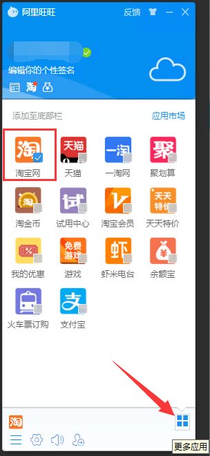 4、下载阿里旺旺并登录,在界面右下角点开更多应用,只勾选淘宝,以外的全都取消勾选