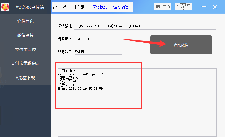 9、从软件上点击启动微信并登录,通过其他微信号给监控端的微信发消息看下是否正常接收,能收到消息说明正常【图6】