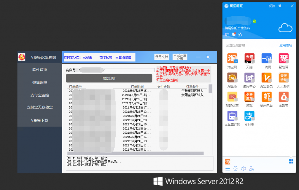 此教程来自互联网在操作pc监控端之前,自觉先关闭杀毒与防火墙,这两处是常见问题的通病,会造成不出二维码、监控不上、不能回调等错误v免签pc监控端依旧支持微信与支付宝,为了支付宝不掉线,采用了旺旺登录方式,严格按照教程配置微信判断是否正常:使用其他微信号发送消息给监控端的微信,或进行支付测试,如果获取到消息说明正常,否则请确认pc监控端是否为最新版,以及是否关闭了杀毒软件与防火墙