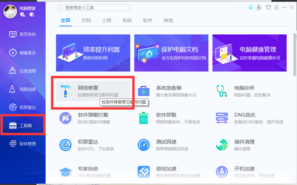 4、使用电脑管家的网络修复工具修复一下网络,重启路由器即可。