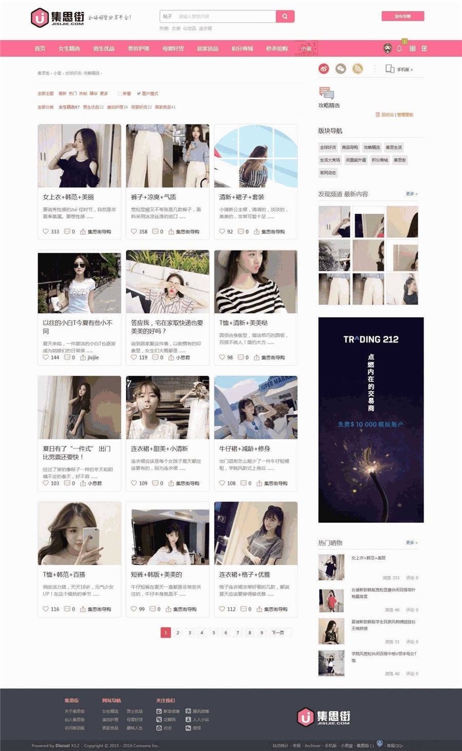 discuz集思街淘宝客模板,采用discuzX3.2内核制作,模板代码优化完善,大气唯美,粉红色更贴合女性类的淘客商品推广。