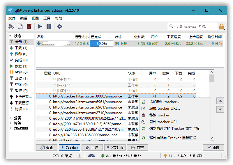 qBittorrent是最好用的免费开源BitTorrent客户端,磁力链接BT种子下载工具,无视文件,支持资源搜索引擎插件、订阅Tracker服务器地址、BT文件做种分享、DHT网络及匿名隐私,采用Vuze兼容协议加密,IP过滤用的Ajax技术,兼容Tracker及代理服务器,基于UPnP/NAT-PMP端口映射排队优先次序。