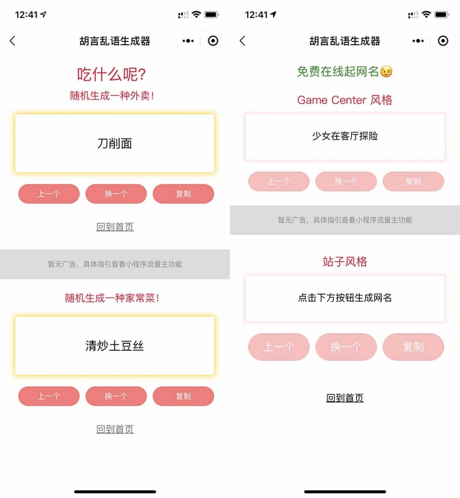 胡言乱语生成器微信小程序源码在线取名等支持流量主收益,这是一款纯前端的一款生成器小程序源码;