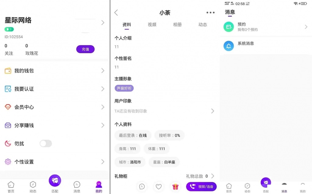 画面以及语音即时同步无延迟 动态可发(图片,语音,视频), 私聊可送礼物,语音通话,视频通话,