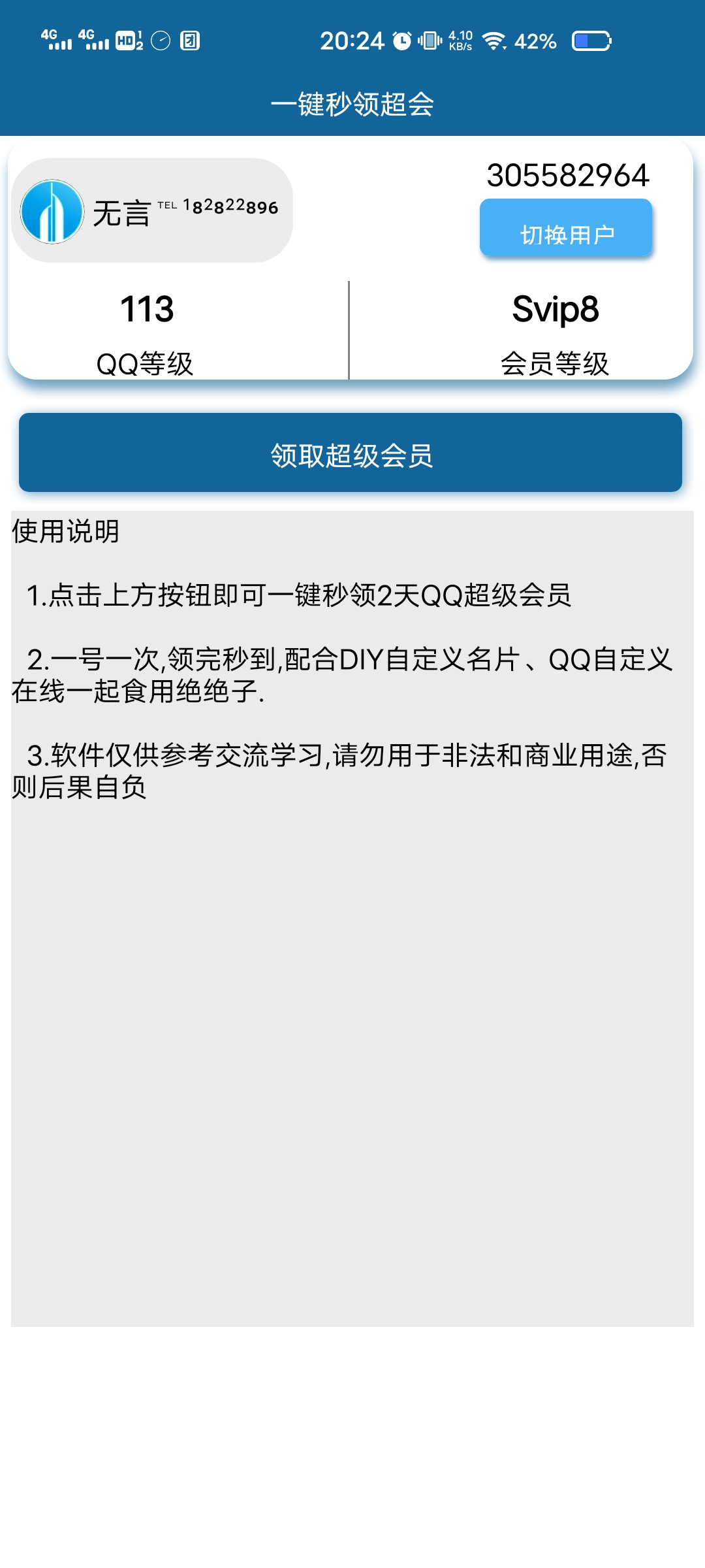 软件介绍 超会白嫖助手来了,一键秒领2天超会,一号一次,速度去领~活动随时可能失效领完秒到,配合DIY自定义名片、QQ自定义在线一起食用绝绝子。 软件截图 资源下载此资源仅限注册用户下载,请先登录客服QQ:305582964 联系邮箱:305582964@qq.com