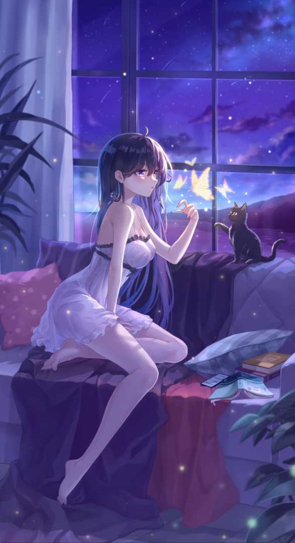 少女与猫 美腿 夜空 星空 唯美4k手机壁纸竖屏动漫美女