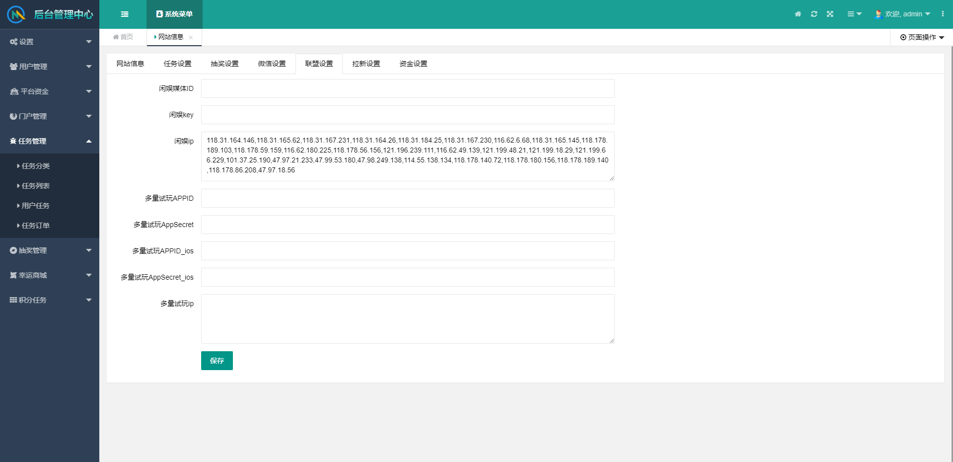联盟配置:联盟功能接口已测试完善,并实现线上收益,每个平台管理只需要申请联盟账户即可对接联盟相关的任务。分为为8/2分配。