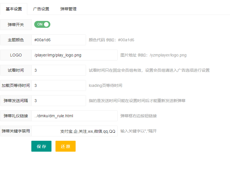 如何显示弹幕规则:player/index.php第 12 行删除【,.dmrules】就显示了