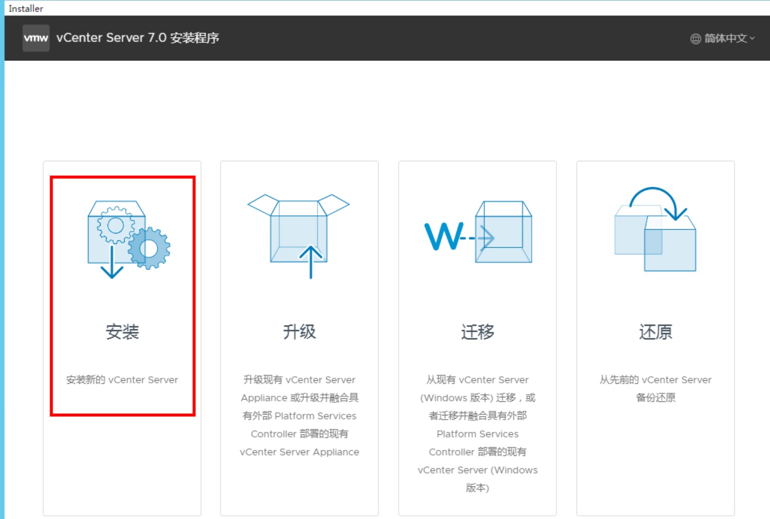 2.选择“安装”,VCSA 7.0版本同时提供其他选项