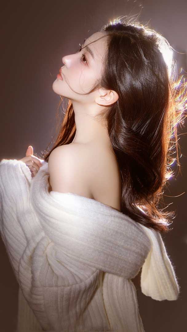 长发波浪 美女侧脸侧颜 露肩 白色毛衣4k手机壁纸美女竖屏全屏