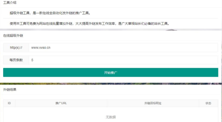 超级外链工具,是一款在线全自动化发外链的推广工具。使用本工具可免费为网站在线批量增加外链,大大提高外链发布工作效率,是广大草根站长们必备的站长工具。工具原理 可能很多第一次使用外链工具的站长朋友们都会担心同一个问题,就是会不会被百度K站、降权等风险?其实大家只要了解此类工具批量增加外链的原理频担心这个问题。 此类工具的原理其实非常简单,网络上几乎所有的网站查询工具(例如爱站网、去查网和本站的站长工具)都会留下查询网站的外链。你要是把网络上的每一个工具站都去查询一遍,就能为查询的网站建设大量的外链外链工具正是利用这个原理,免除你手动去访问每一个工具站查询,利用收集到的工具站列表,在线自动为你的网站查询。这种方法建设的外链是正规有效的,所以不必担心被K站和降权的风险。