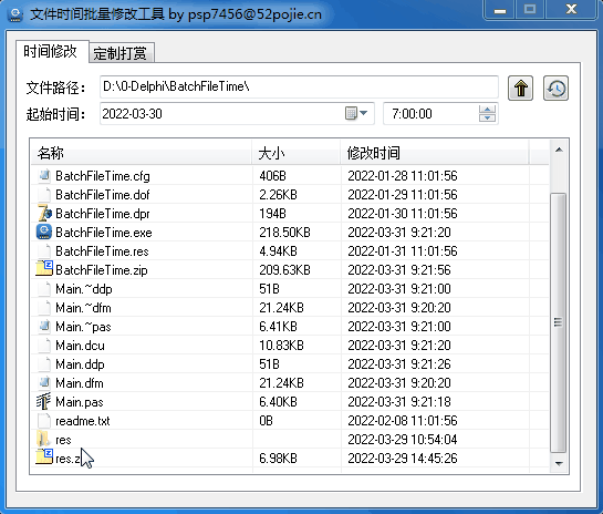 软件介绍 1、批量修改文件的修改时间 2、规律是每个文件的修改日期推后一天,时间在7:00-18:00之间随机 于是随手就把以前做过的项目改了一下就完活了。 软件截图 资源下载此资源下载价格为0.1U点点击检测网盘有效后购买,VIP免费立即升级客服QQ:305582964 联系邮箱:305582964@qq.com