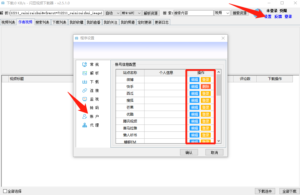 另外,它还支持会员视频下载(需要有VIP账号),点击设置—账户—登录对应平台的账号。