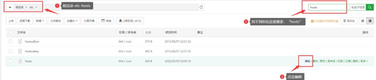 6)找到在宝塔的根目录 /etc/hosts文件,进行编辑!