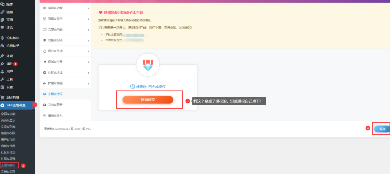 9)最后就可以回到Wordpress程序后台-zibll子比主题设置-主题授权