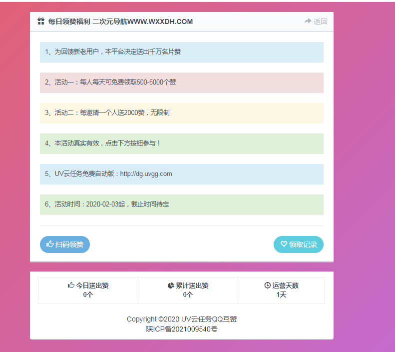 用户扫码后每天可以免费领取500-5000个赞,非常适合无成本回馈客户