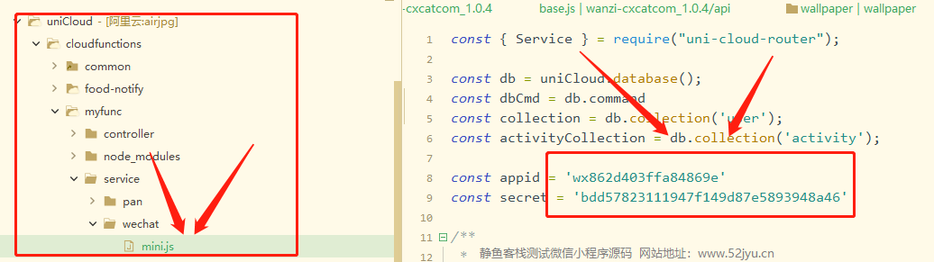 然后我们打开uniCloud/cliudfunctions/myfunc/service/wechat/mini.js然后修改您的小程序ID和密钥