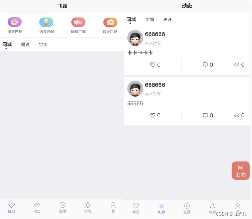 功能:社区动态,即时聊天,私聊,好友系统,礼物系统,直播系统,缘分匹配,金币系统