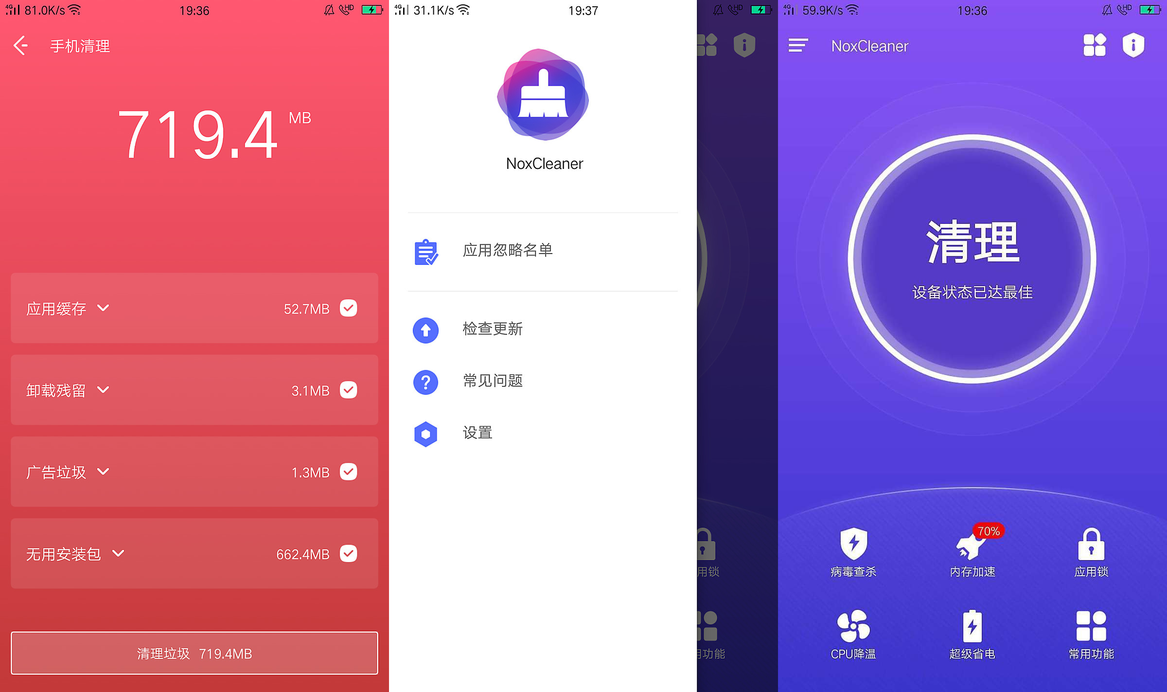NoxCleaner是一款清理优化工具应用,小工具带来大功效,专治内存释放以及垃圾广告和残留等问题,给你的手机来个彻底的释放,界面很简洁操作也非常的简单。