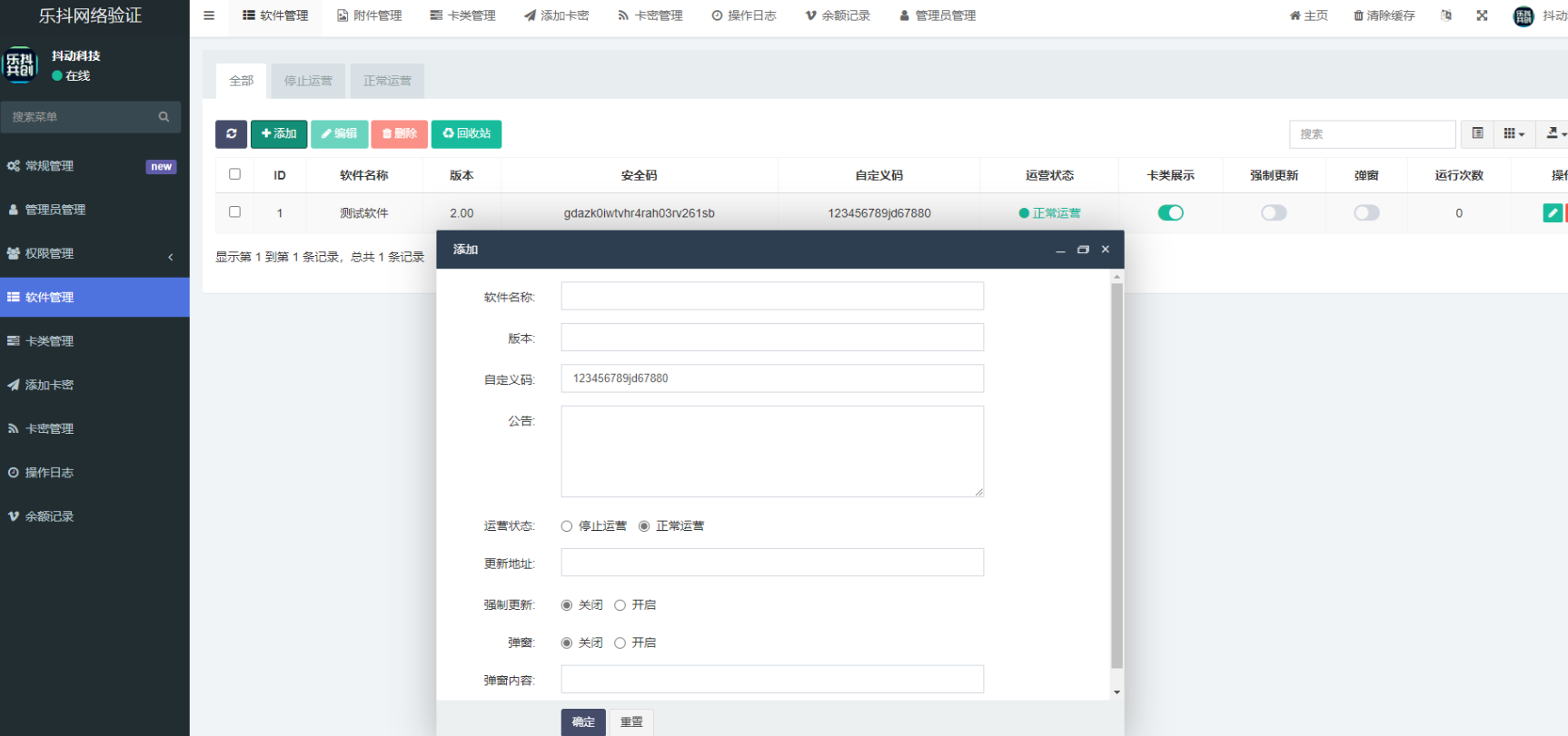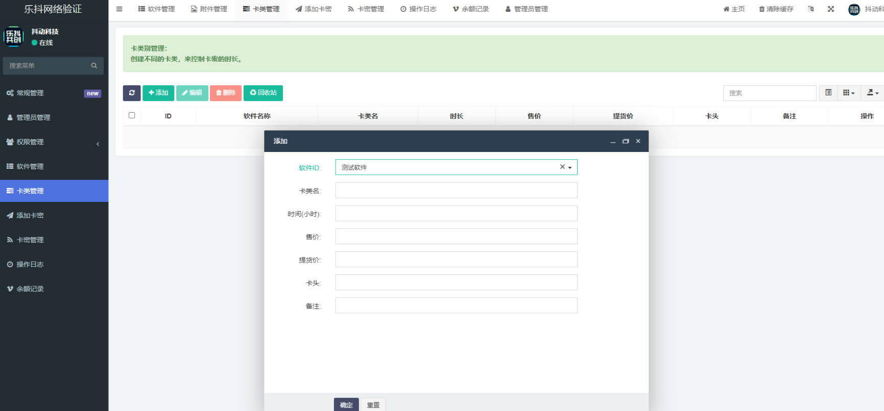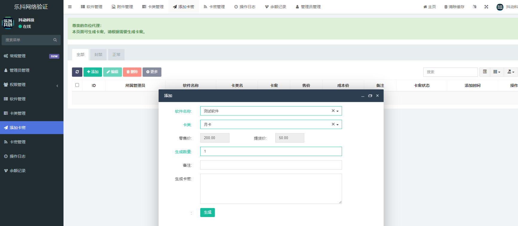 支持卡密时长可自定义,支持任意时长卡密,设置价格,代理拿货扣除余额