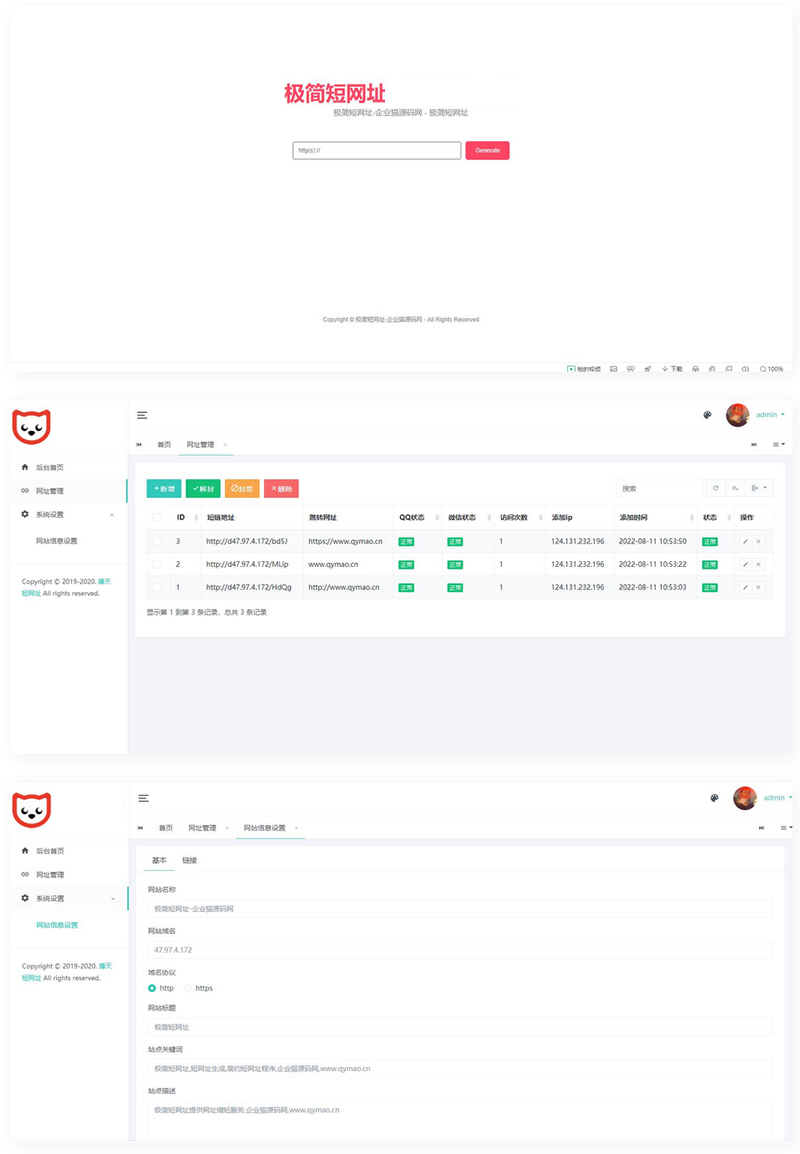 前两年流行的新浪短网址和一些小站长搭建的短网址基本都gg了, 想要一个既稳定又好用的短网址系统只有自己搭建了,今天给大家分享一个很好用的短网址系统, 本系统是国内程序员开发,后台简洁,适合自用 图片: 资源下载此资源下载价格为6.6U点点击检测网盘有效后购买,VIP免费立即升级客服QQ:305582964 联系邮箱:305582964@qq.com