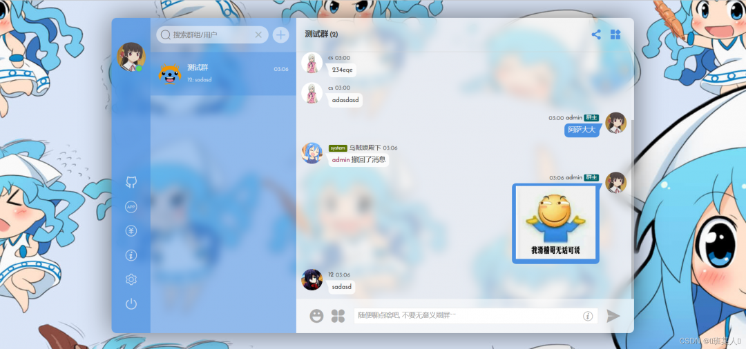 一款二次元的Web多人在线网络聊天系统,偏二次元的Web多人在线聊天应用,使用Node.js、Mongodb、Socket.io和React编写,使用起来还行,挺简洁的,有兴趣的可以玩玩。