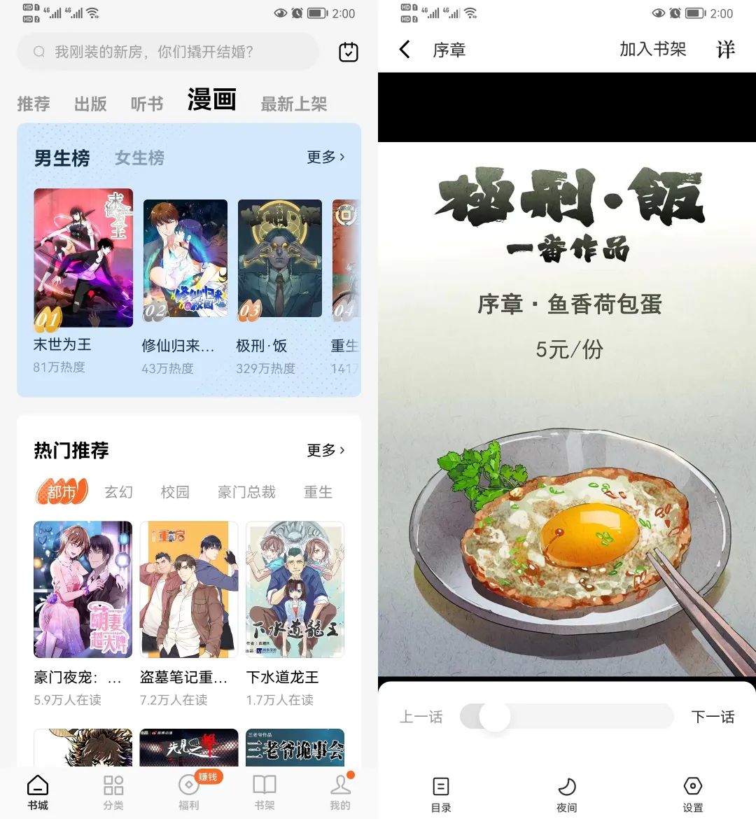 这边打开之后就是下面的页面软件内置听书 漫画 小说为一体
