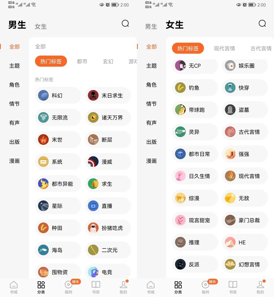 小说分类里面大致分为男频和女频在左上角就可以点击切换 里面呈现的内容也会随之改变 种类的也是非常的齐全