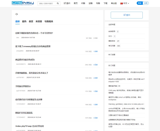 CmsEasyQA问答系统是一个以PHP+MySQL进行开发的php问答系统源码,拥有积分、打赏、分享等功能,激发用户主动创作内容,扩散有价值的信息,从而有利于品牌传播和产品营销。