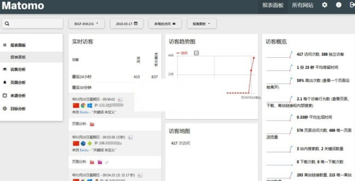 matomo网站统计系统(之前叫Piwik)是一套基于PHP5+MySQL技术构建的开源网站访问统计系统,前身是phpMyVisites。Piwik可以给你详细的统计信息,比如网页浏览人数,访问最多的页面,搜索引擎关键词等等流量分析功能。此外,它还采用了插件扩展及开放API架构,可以让用户根据 自已的实际需求创建更多的功能。