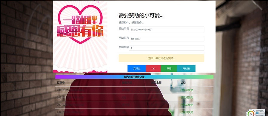 一款很老的版本了,看到自己网站没有该资源就搬运过来了。自行下载使用吧 赞助系统可以用来个人收款或者赞助页面使用,傻瓜式一键安装 上传所有文件至网站根目录或域名+install 后台域名/admin 账号admin 密码123456 资源下载此资源下载价格为2U点点击检测网盘有效后购买,VIP免费立即升级客服QQ:305582964 联系邮箱:305582964@qq.com