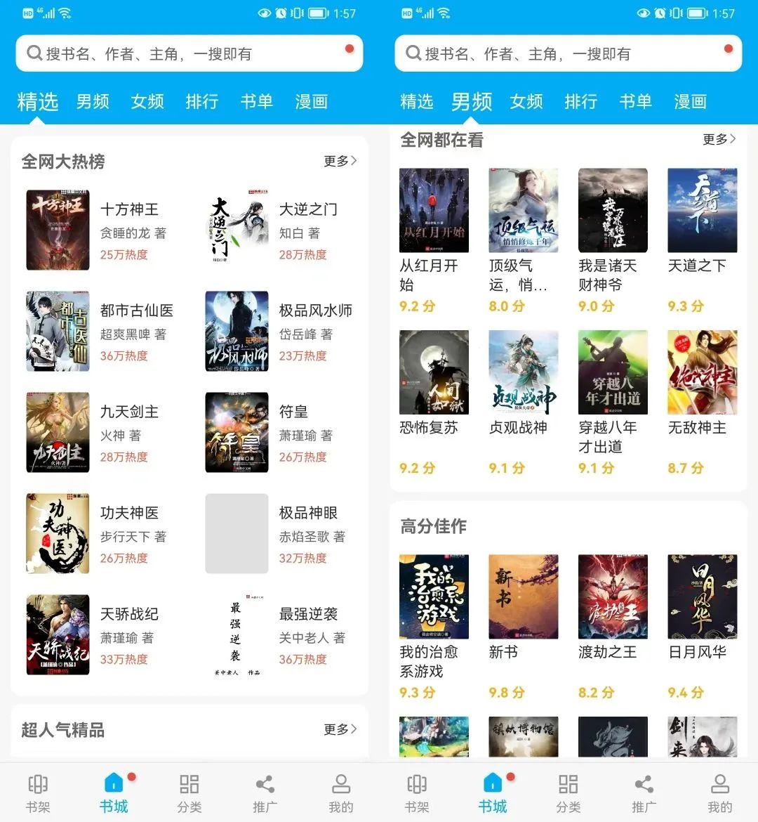 这边还分为男频和女频,切换之后呈现的内容也会有所改变