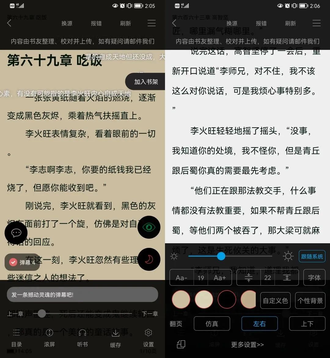 阅读界面的设置功能也是非常齐全 弹幕轮播功能 背景颜色 字体大小等等