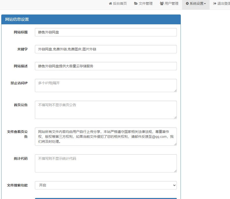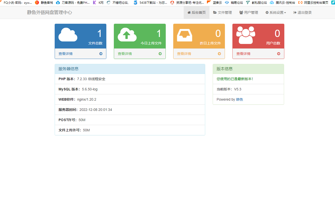 静鱼外链网盘,是一款PHP网盘与外链分享程序,支持所有格式文件的上传,可以生成文件外链、图片外链、音乐视频外链,生成外链同时自动生成相应的UBB代码和HTML代码,还可支持文本、图片、音乐、视频在线预览,这不仅仅是一个网盘,更是一个图床亦或是音乐在线试听网站。新版本支持对接阿里云OSS、腾讯云COS、华为云OBS、又拍云、七牛云等云存储,同时增加了图片违规检测功能。