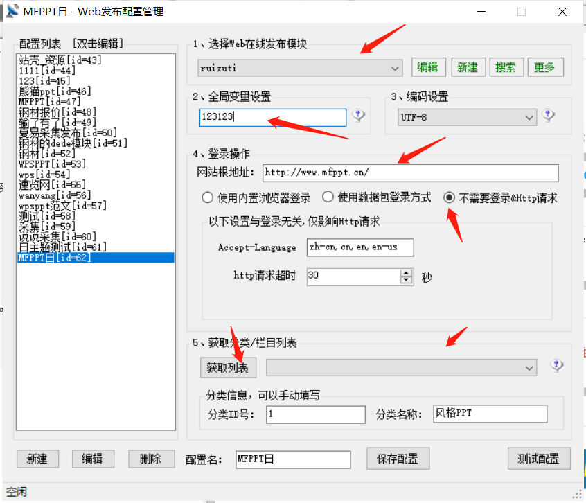 - 点击“获取列表”,获取到网站分类名称即为配置成功;点击“保存配置”,关闭窗口即可。