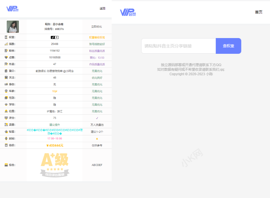 快手在线查询权重源码次快手权重查询优化了算法,修复很多之前抖音遇到的算法上的bug,不再有随机数,每一项都是根据实际情况固定输出(包括评分,发作品时间等等)