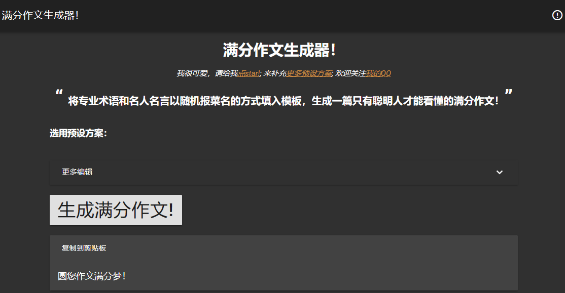 在线满分作文生成器html网页源码,将专业术语和名人名言以随机报菜名的方式填入模板,生成一篇只有聪明人才能看懂的满分作文!