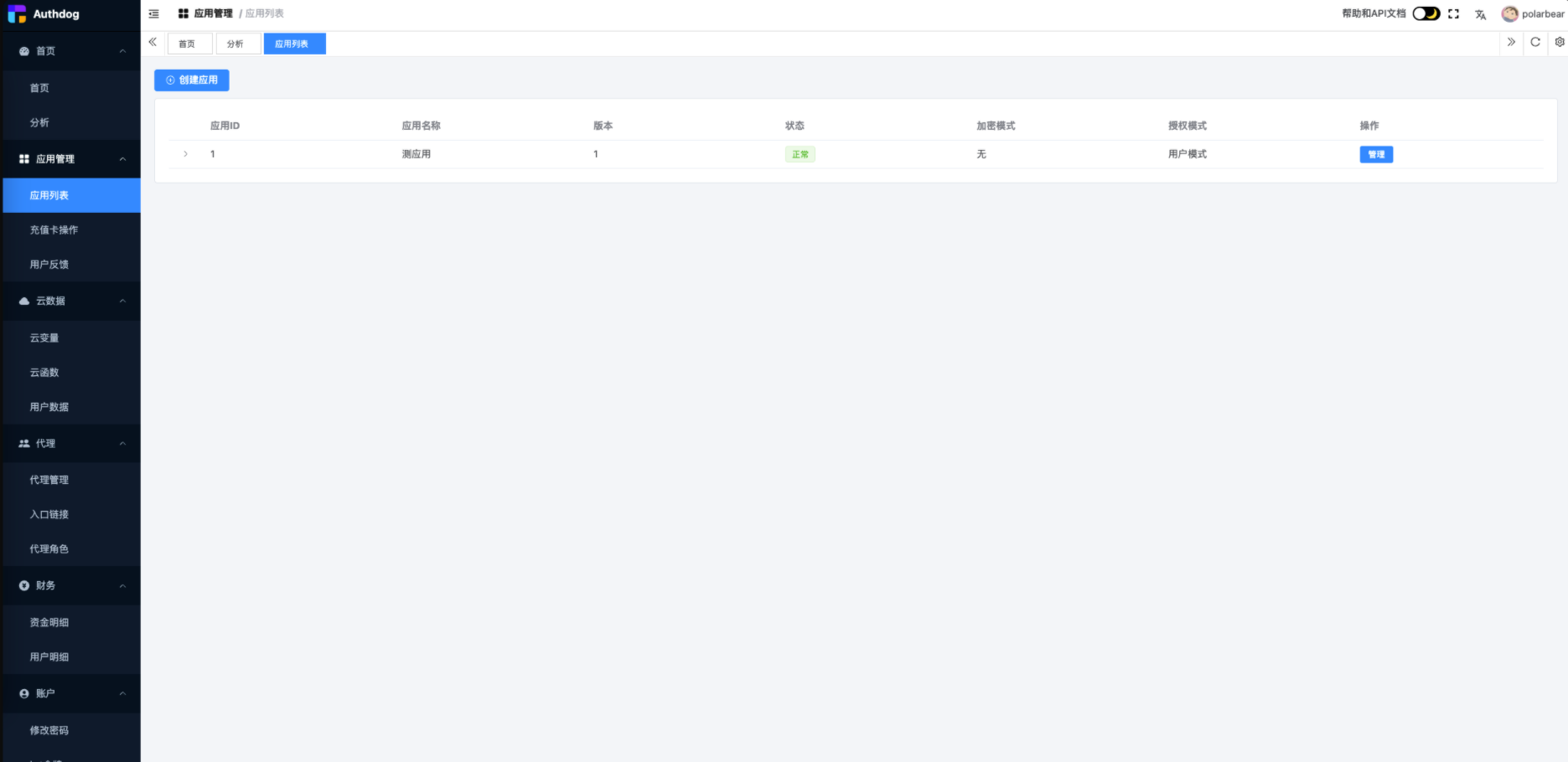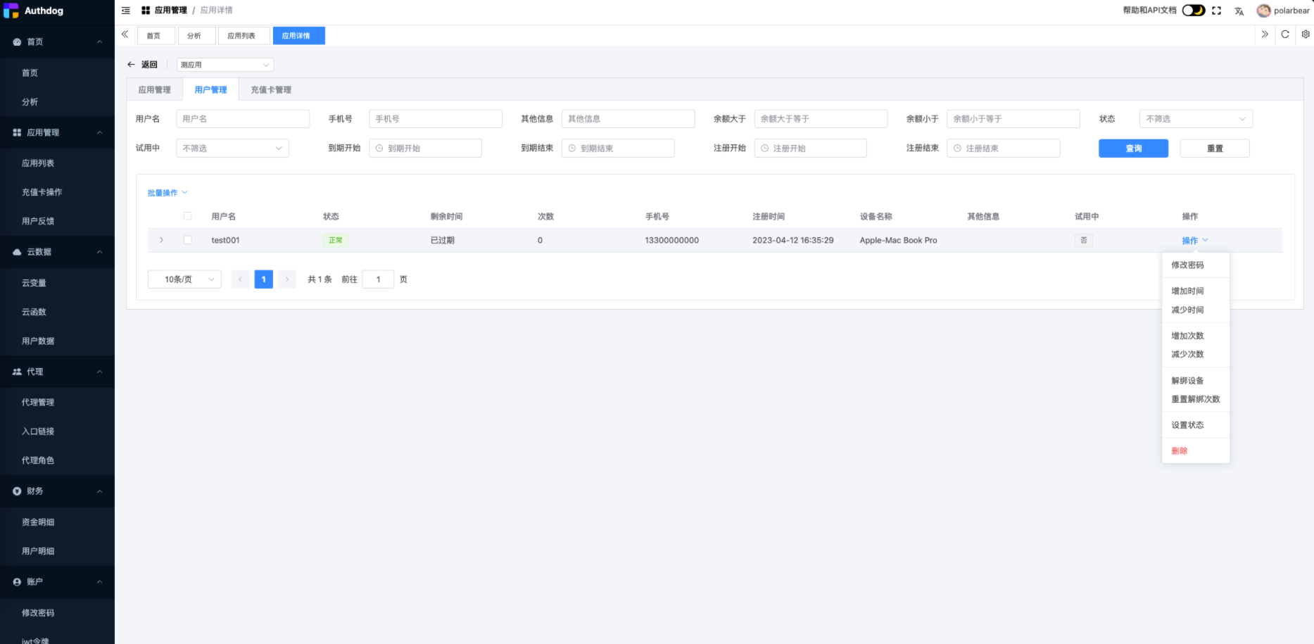 提供包括、设备ID模式应用、用户模式应用、版本更新、应用公告、试用时间、绑定设备、解绑惩罚、扣点收费等众多功能