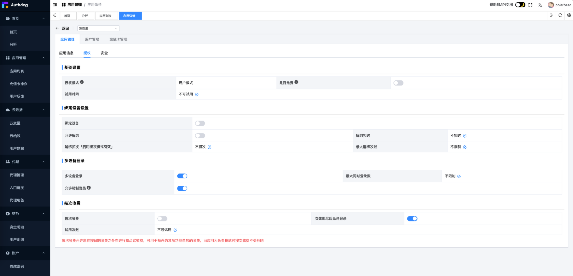 authdog在按时收费之外还设计了一个扣点收费的模式,您也可以理解为按?收费,并且提供api来扣减用户点数,还可以设置当用户点数为0时是否允许通过授权。