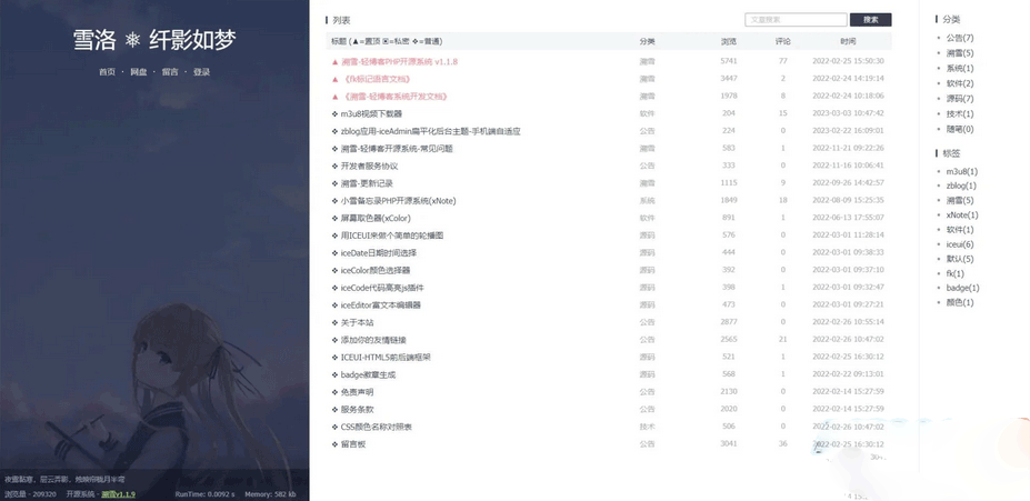 溯雪(sxlog)是一款极为干净的轻博客程序,整个程序包不到100KB,极为简小,比一张照片都要小很多,简洁高效,占用内存极小,不依赖任何数据库,不依赖富文本编辑器,但她却拥有十分强大的排版功能,这得力于她自身的fk标记语言,在开发她之前我有想过溯雪的风格类型,兼容PC端和移动端,舍弃繁杂的界面和程序结构,以最直观最干净的方式呈现给用户,然后溯雪诞生了,她的核心基于fk标记语言,所以她的存在将是目前博客程序前所未有的简洁,并且是十分高效的。