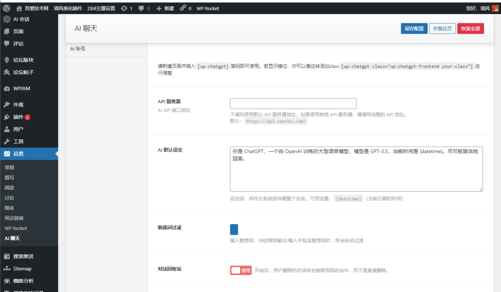 第一步:登录WordPress后台,并找到ChatGpt-WP插件。 第二步:进入插件设置页面,输入您自己的OpenAI账户信息和API接口地址。建议设置多个账号,以防止请求受限,每次请求将自动随机选择一个账号。 第三步:保存设置并测试聊天功能是否正常。