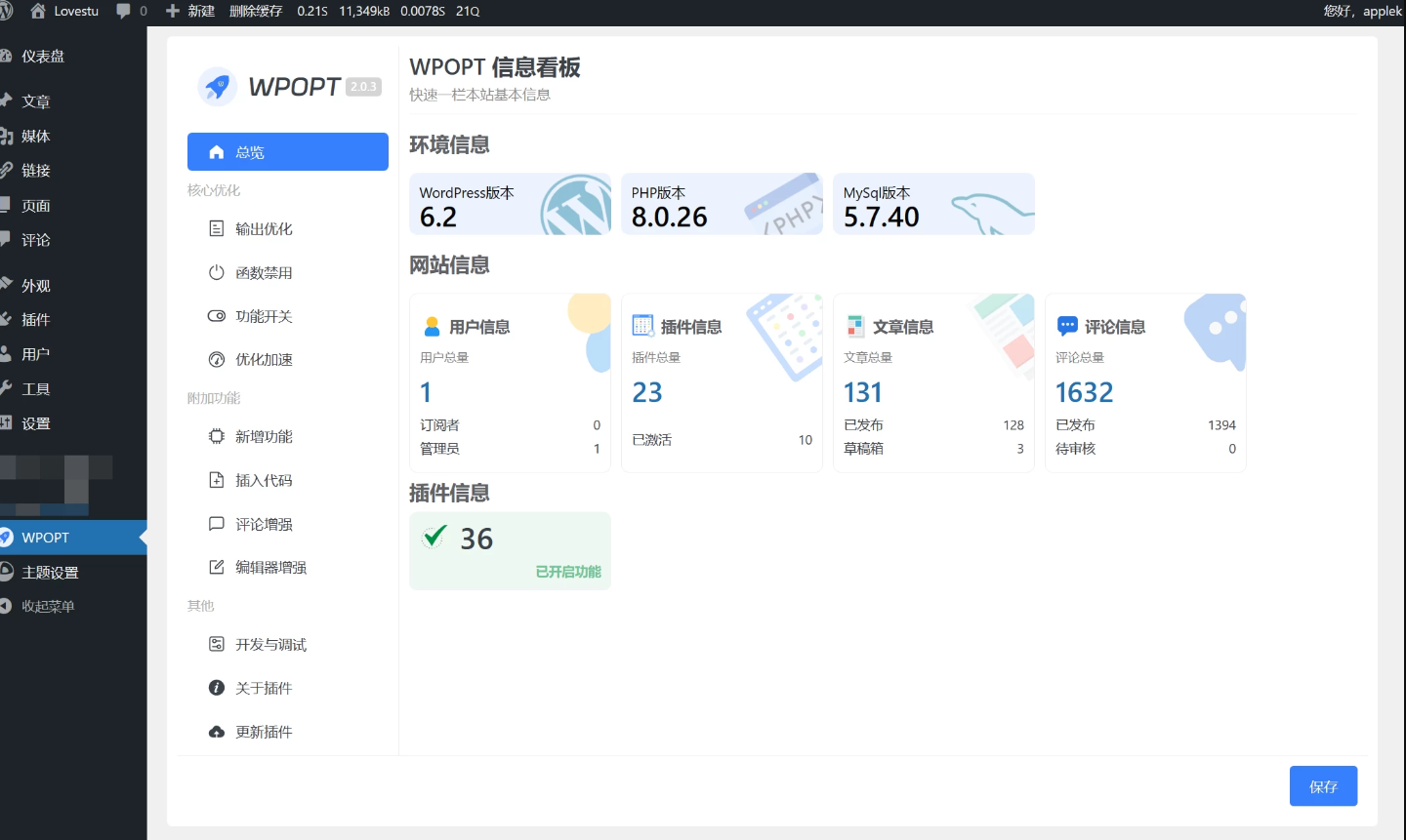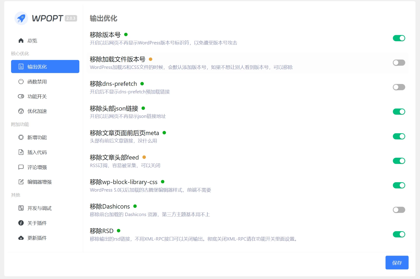 WPOPT插件一款WordPress优化插件,旨在对WordPress底层功能进行优化,支持功能开关和系统加速等功能。