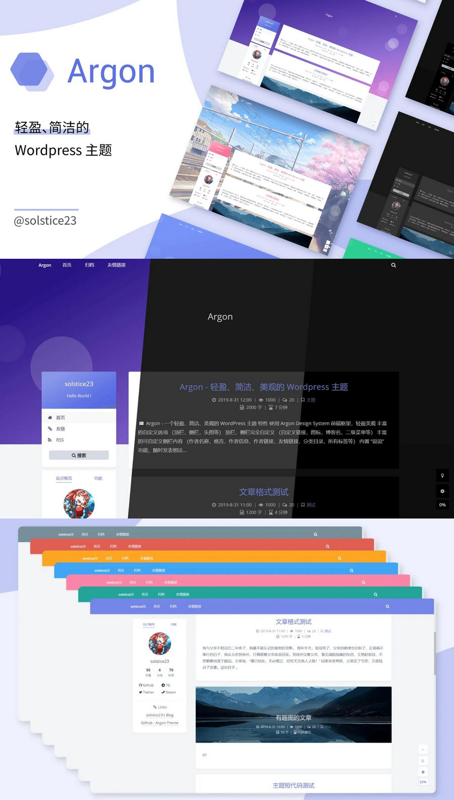 WordPress轻盈、简洁、美观的博客主题Argon v1.3.5是一个适合使用的博客主题。该主题使用Argon Design System前端框架,界面非常美观,并且拥有丰富的功能。