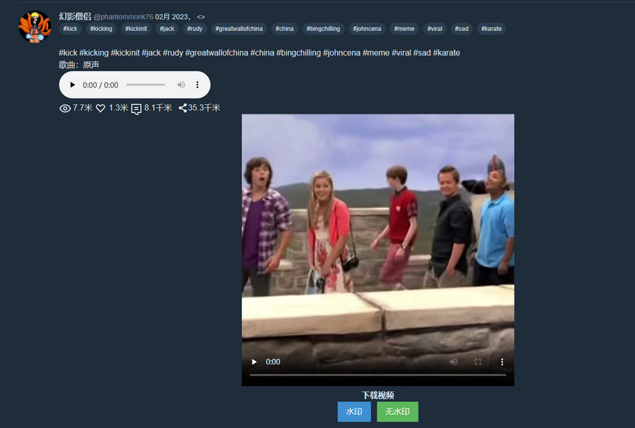 不过,要打开网页并观看内容,需要先搜索用户。ProxiTok支持按用户名、标签TAG、音乐ID和视频ID进行搜索,并且支持TikTok无水印视频的下载。