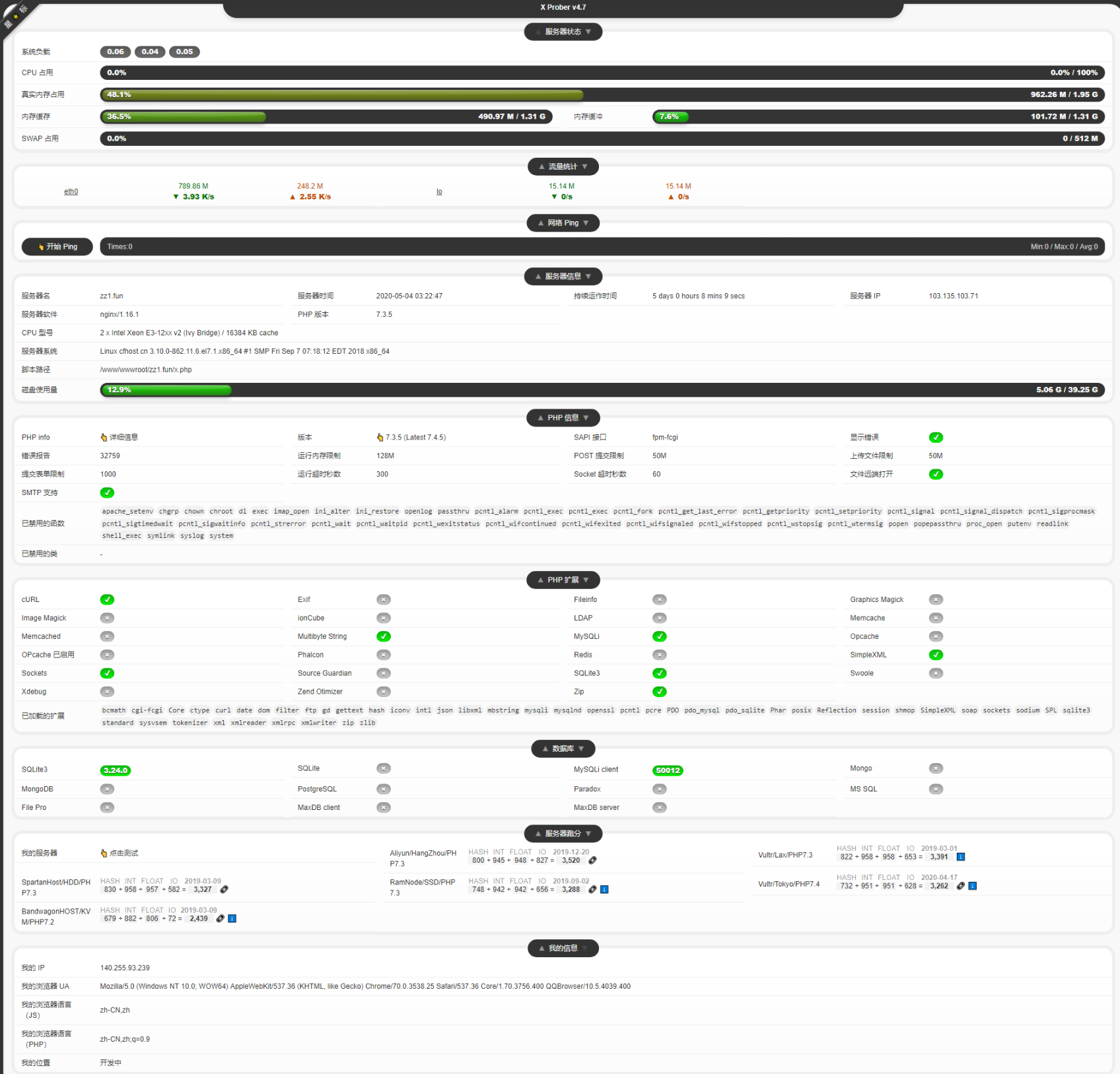 前两天我看到有人分享了一个服务器状态页面,我之前使用的是ServerStatus,但发现这个免费开源的PHP探针——x-prober更加精致好看。
