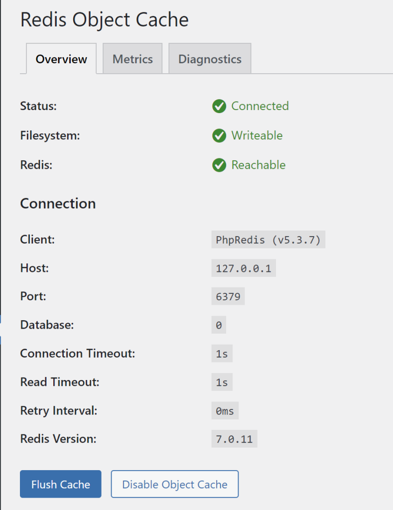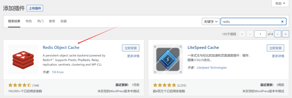 然后,在WordPress后台搜索插件”Redis Object Cache”并进行安装。