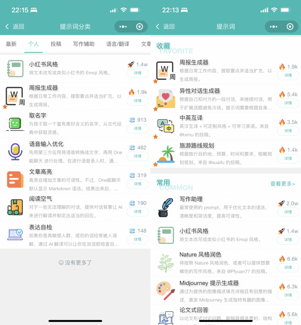 – 提示词功能(角色扮演),内置近300种提示词,包括小红书文案书写、周报生成和异性对话生成器等。